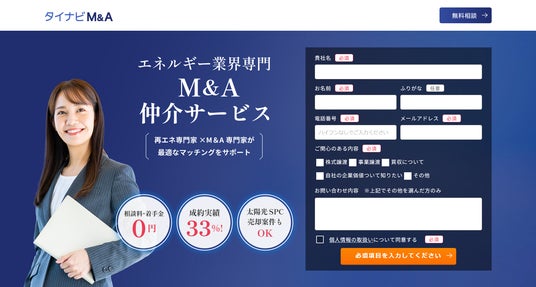 太陽光発電・蓄電池のプラットフォーム「タイナビ」シリーズを運営する株式会社グッドフェローズ(本社:東京都品川区 代表取締役社長:長尾泰広、以下「当社」)は、M&Aアドバイザリー・仲介業務を行う株式会社ビズハブ(本社:東京都港区、代表取締役社長:金子義典、以下「ビズハブ社」)と共同で、太陽光発電システムを中心とした再生可能エネルギー事業を展開する企業を対象としたM&A仲介サービスの提供を開始しました。相談料、着手金などは一切不要で、成果報酬型モデルを採用することで、M&Aを初めて検討する企業でも安心して相談ができる仕組みを実現。本サービスを通して、当社は事業継承や人材不足などの業界課題に対応し、エネルギー業界の発展と脱炭素社会の実現を目指して参ります。