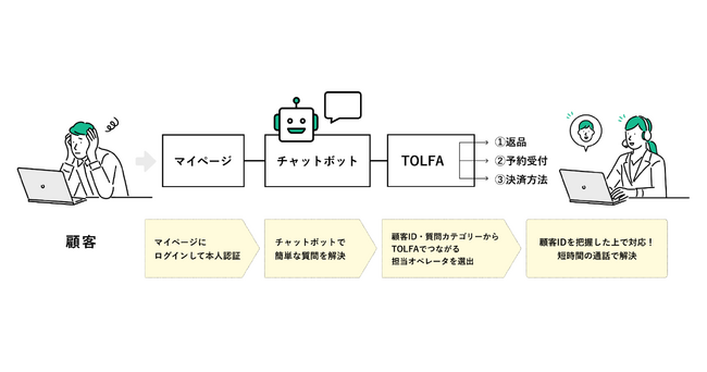 「AIチャットボット×WEB無料通話」の連携により、サービス利用者に困りごとが発生した際に、WEB上で実施した操作とコールセンターへのお問い合わせをシームレスにつなぐカスタマーサポートの提供が可能となります。利用者がWEBサイトでマイページにログインし、WEBサポートからコールセンターにTOLFAで連絡をすれば本人確認や質問カテゴリーの「重複確認」が不要になります。また将来的にはAIチャットボット「KARAKURI chatbot」・FAQツール「KARAKURI smartFAQ」での行動データを、通話(TOLFA)対応時に把握できるようにし、応対時間の短縮及び応対品質の改善の実現も目指してまいります。