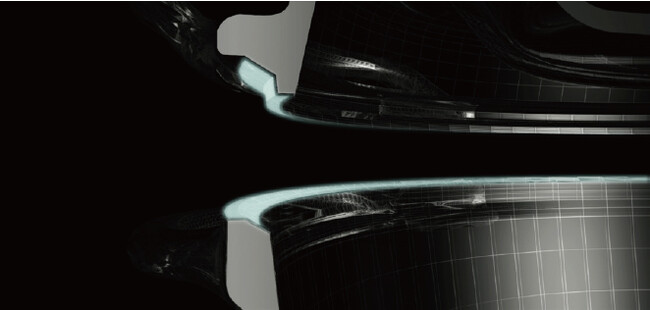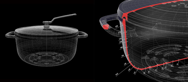 鍋の鋳物の肉厚を一定とせず、調理性能上無駄な部分の肉厚を緻密な構造計算によって、極限まで削ぎ落としました。従来の肉厚3mmから薄さ1.8mm(最薄部)に。そうすることで、バーミキュラの高い調理性能を維持しながらも、約30%という大幅な軽量化を実現。鍋の取り回しがよくなるだけではなく、調理時間の大幅な短縮も可能になりました。