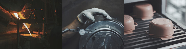 再溶解し、原料に戻ったバーミキュラを熟練の職人による鋳造加工・精密加工・ホーロー加工の工程を経て、新たなバーミキュラに生まれ変わります。