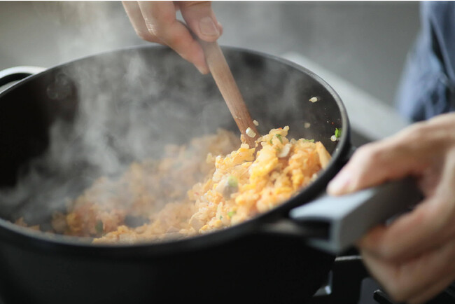 瞬間蒸発ホーローで炒め性能が大幅にアップしたオーブンポット2は、鍋が瞬間的に余分な水分を蒸発させてくれます。だから、振らずにパラッパラの絶品チャーハンが簡単に作れます。さらに軽量化によって、大きなサイズの鍋で大容量のチャーハンを一度に作ることも可能に。