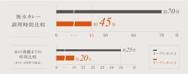 ・薄くなったことで熱効率がさらに良くなり、従来のオーブンポット1に比べ無水調理にかかる時間が最大約2/3に短縮。