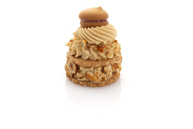 香ばしいピーナッツとバニラ風味の組み合わせが絶妙なピーナッツ クッキーにプラリネのバタークリームと粗く砕いたヘーゼルナッツをたっぷりとトッピング。ナッツとクッキーのザクザクした食感とクリームのなめらかなくちどけが好相性です。