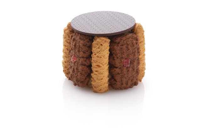 ショコラとカフェが主役の濃厚なケーキ。チョコレート クッキーとほんのり生姜をきかせたクリーム フィンガー、コーヒーのバタークリームの3つの味わいが三位一体の味わいを奏で、中に忍ばせたスプライズのバニラの風味が優しい余韻を残します。
