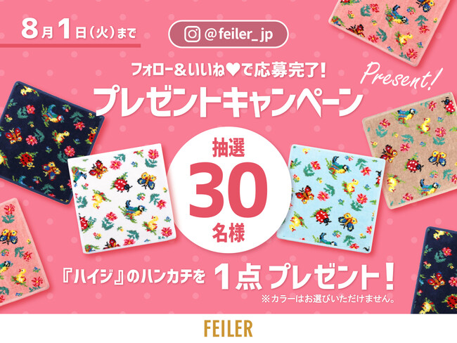 フェイラー公式Instagram[ @feiler_jp ]をフォローのうえ、上記ビジュアルの投稿にいいねをしてくださった方の中から、抽選で30名様にフェイラーの人気柄『ハイジ』のハンカチを抽選で30名様にプレゼント!たくさんのご応募お待ちいたしております。