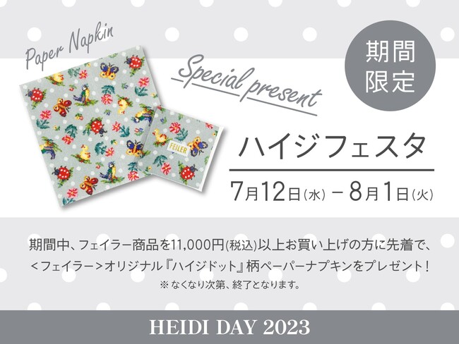 フェイラージャパン株式会社(本社:東京都千代田区、代表取締役社長:八木直久)は、#ハイジの日2023に向け、2023年7月12日(水)に、フェイラーの人気柄『ハイジ』の新柄『ハイジドット』の商品を、フェイラー銀座本店、フェイラー天神地下街店、全国有名百貨店フェイラーショップ( https://www.feiler-jp.com/shoplist/ )およびフェイラー公式オンラインショップ( https://feiler.jp/ )にて発売することを発表いたします。
