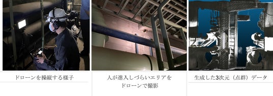 2.人が立ち入りづらいエリア(配管で死角になっている箇所、高所、狭所)については狭小空間専用ドローン「IBIS2」による撮影を行い、画像処理(SfM)による点群生成を行う。