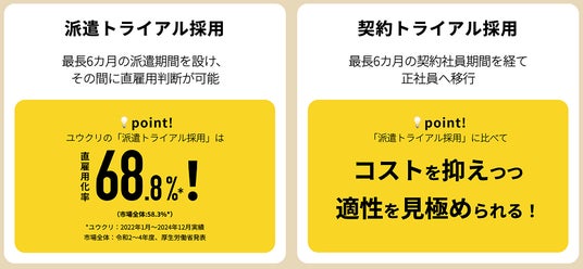 「トライアル採用」には「派遣トライアル採用」と「契約トライアル採用」の2つのプランがあり、自社のニーズに合わせて選択できます。