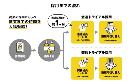 「派遣トライアル採用」では、派遣期間中は派遣元(ユウクリ)の雇用となるため、実際に採用するまでは採用手続き・社会保険の加入手続き等は不要です。また、通常の派遣とは異なり、社員採用と同様の面接や実技テストなどを実施できます。「契約トライアル採用」の場合、給与や就業時間など就業先の就業規則に則って勤務してもらえます。
