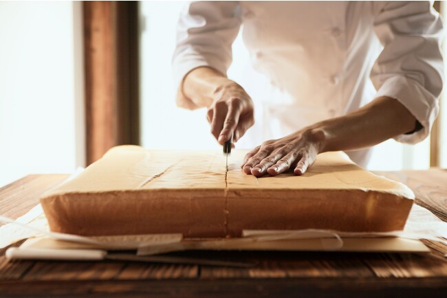 台湾の伝統的な焼き方を再現するため、横が1メートル以上もある巨大な台湾カステラを、店内で豪快に焼き上げます。