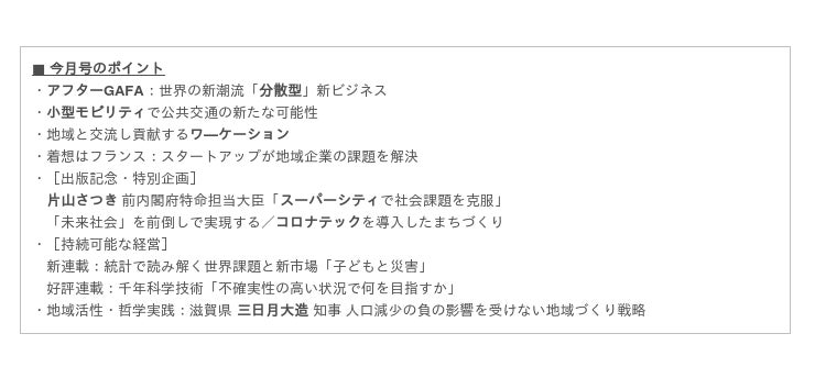 これまでの社会は大都市に人口が集中し、高密度化することで発展を遂げてきました。しかし、コロナ禍はそのリスクを顕在化させる結果となり、改めて地方への注目度が高まっています。今月の特集では、脱一極集中や分散型社会がもたらす新ビジネス、地方における新産業がテーマです。社会の様々な側面で変化が求められる今、こうした流れは、地方において新産業を生み出す可能性があるとともに、ものづくりや金融、食や農業、エネルギーなど、従来、集権的なシステムで成り立ってきたものが解体・分散化し、新たなビジネスの勃興を加速させています。