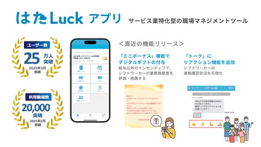 直近では、「はたLuckアプリ」と連動した「エンゲージメントサーベイ」機能や「トーク」のリアクション機能、「ミニボーナス」機能などを追加し、日常業務の中で企業理念や価値観の浸透を促すコミュニケーション機会を広げています。2025年には累計25万人のユーザーID数を突破し、全国の外食・ホテル・小売・アミューズメント・ショッピングセンターなど幅広いサービス業の職場で導入されています。