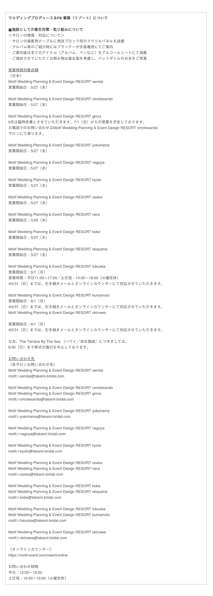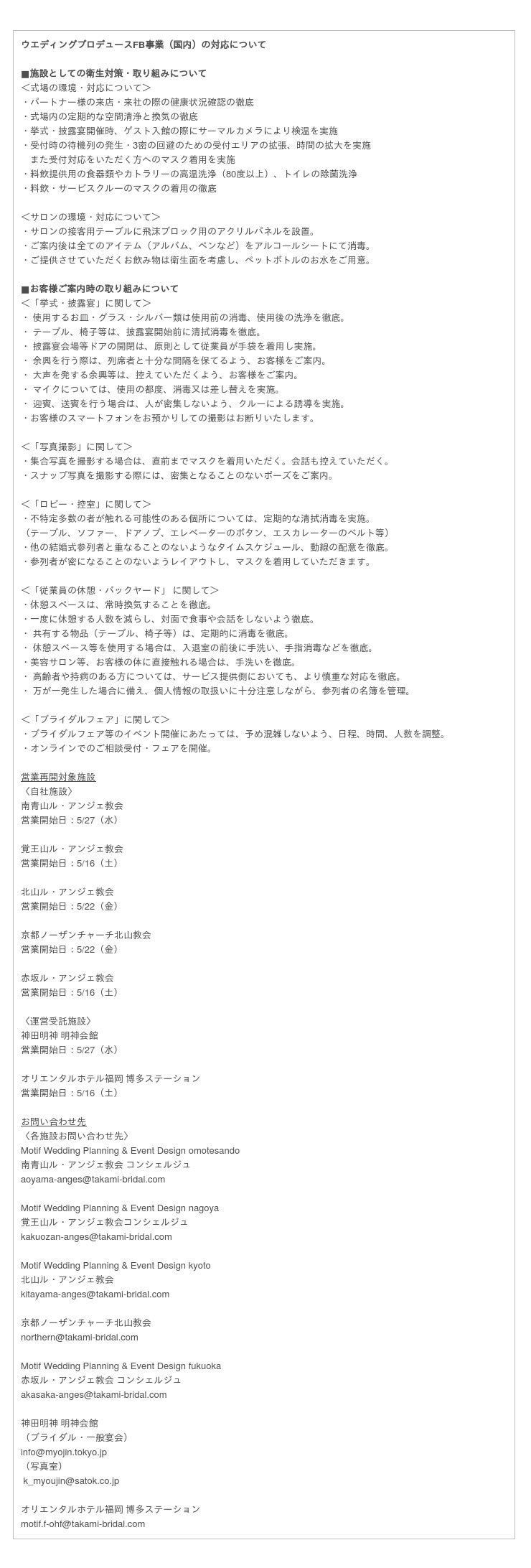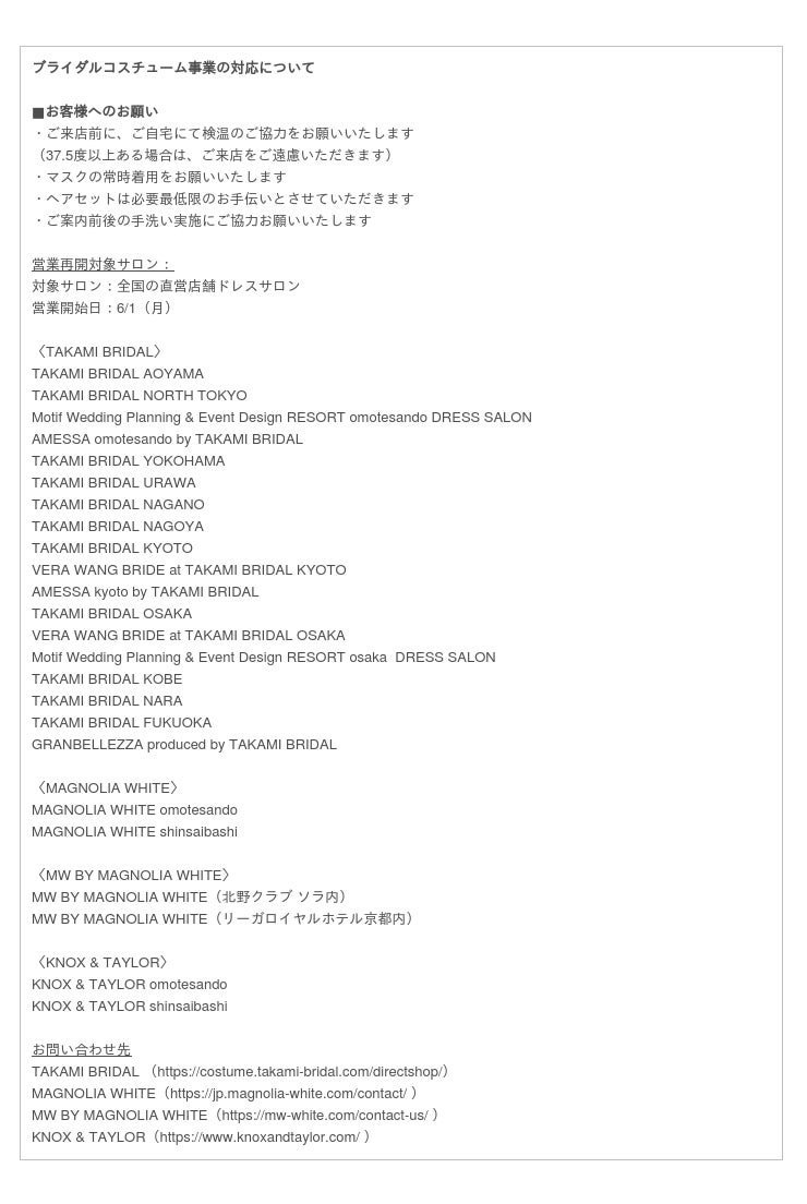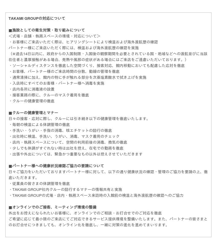 ご不便をお掛けしてしまい誠に申し訳ございませんが、 TAKAMI GROUP一同誠心誠意対応させていただきますので、ご結婚式を控えていらっしゃる新郎様新婦様におかれましては、ご不安なことがございましたら各お問い合わせ先までご連絡くださいませ。