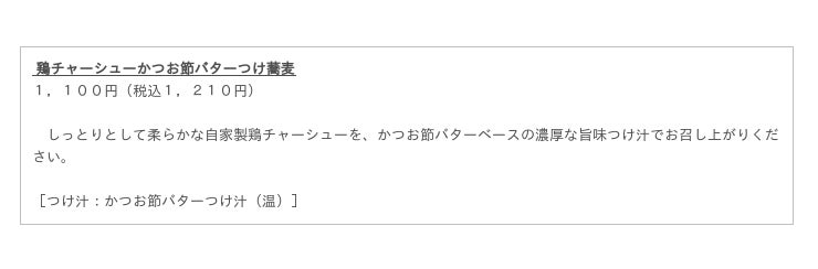 今回のリニューアルでは、「ベジつけ蕎麦」と「鶏チャーシューかつお節バターつけ蕎麦」の2種類を新たに販売するほか、いくつかの味を同時に楽しみたい方におすすめの「つけ汁追加オプション」が加わりました。トッピングやつけ汁追加を組み合わせて、お好みの一杯をお召し上がりください。