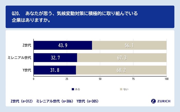 「Q20.あなたが思う、気候変動対策に積極的に取り組んでいる企業はありますか。」と質問したところ、Z世代(n=312)は「ある」が43.9%、「ない」が56.1%、ミレニアル世代(n=306)は「ある」が32.7%、「ない」が67.3%、Y世代(n=305)は「ある」が31.8%、「ない」が68.2%という回答となりました。
