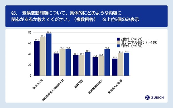 Q1で「非常に関心がある」「やや関心がある」と回答した方に、「Q3.気候変動問題について、具体的にどのような内容に関心があるか教えてください。(複数回答)」と質問したところ、Z世代(n=197)は「気温の上昇」が64.5%、「海の温暖化と海面の上昇」が41.1%、ミレニアル世代(n=169)は「気温の上昇」が71.6%、「海の温暖化と海面の上昇」が49.7%、Y世代(n=186)は「気温の上昇」が78.0%、「嵐の被害の増大」が49.5%という回答となりました。