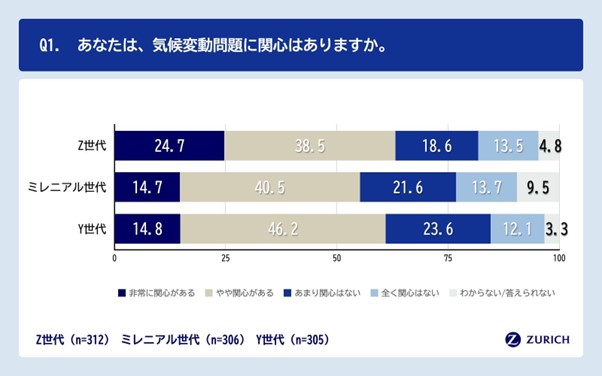 「Q1.あなたは、気候変動問題に関心はありますか。」と質問したところ、Z世代(n=312)は「非常に関心がある」が24.7%、「やや関心がある」が38.5%、ミレニアル世代(n=306)は「非常に関心がある」が14.7%、「やや関心がある」が40.5%、Y世代(n=305)は「非常に関心がある」が14.8%、「やや関心がある」が46.2%という回答となりました。
