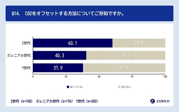 CO2排出量をオフセットする方法の認知度、第1位「Z世代」60.1%、第2位「ミレニアル世代」40.3%、第3位「Y世代」37.9%の結果に