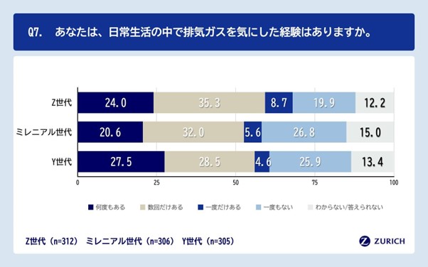 3世代の約6割が日常生活の中で「排気ガス」を気にした経験あり、Z世代においては68.0%と高い結果に