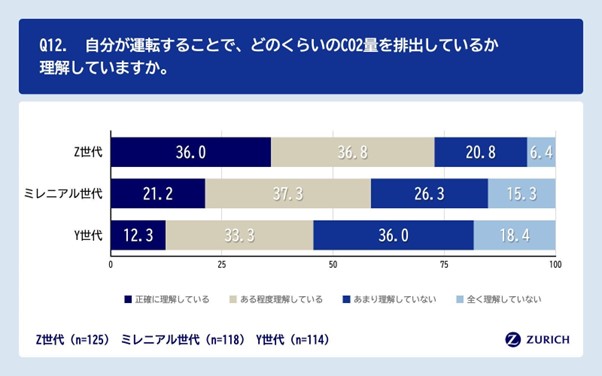 Q11で「何度もある」「数回だけある」「一度だけある」と回答した方に、「Q12.自分が運転することで、どのくらいのCO2量を排出しているか理解していますか。」と質問したところ、Z世代(n=125)は「正確に理解している」が36.0%、「ある程度理解している」が36.8%、ミレニアル世代(n=118)は「正確に理解している」が21.1%、「ある程度理解している」が37.3%、Y世代(n=114)は「正確に理解している」が12.3%、「ある程度理解している」が33.3%という回答となりました。