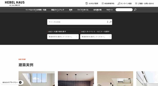 検索窓を中央に配置したヘーベルハウス ブランドサイト: https://www.asahi-kasei.co.jp/hebel/index.html/