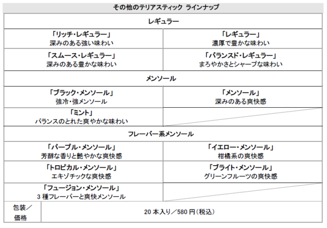 今回の「テリア ブラック パープル メンソール」の発売により、テリアスティックのラインナップは全13種となります。