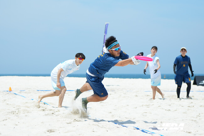 ビーチアルティメットは、砂の上でアルティメットを行う5人制のチームスポーツです。通常のアルティメットより少し小さい75m×25mのフィールドでプレーを行い、フライングディスクを落とさずにパスをして運び、コート両端のエンドゾーン内でディスクをキャッチすれば得点となります。