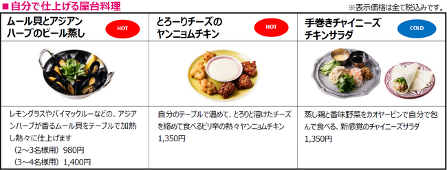 特長2.:オープンエアな空間にぴったりな特別メニュー!テーブルで仕上げ、できたてを楽しめる屋台料理や、“やみつきになるおいしさ”のアジア風デザートが登場