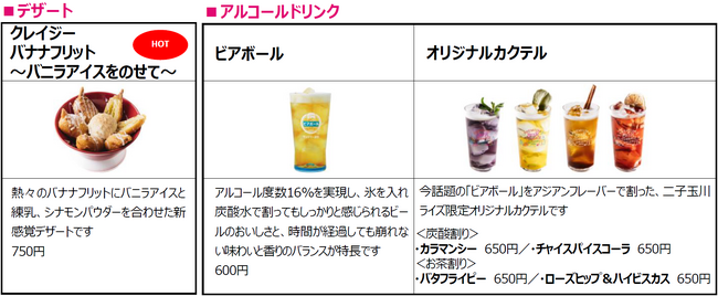アジア各国の料理を味わえ、小旅行のような気分を楽しめることをコンセプトにした今年のビアテラスでは、テーブルでお客さま自身が料理を仕上げる屋台料理が登場。ドリンクメニューには、サントリー「神泡のザ・プレミアム・モルツ」をはじめ、話題の「ビアボール」を使用した、二子玉川ライズ限定のオリジナルカクテルや、種類豊富なノンアルコールドリンクなど、お酒を飲まれる方もそうでない方も楽しめる充実のラインアップをそろえております。