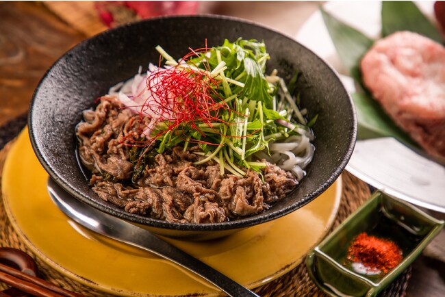 スープは焼津産かつお節と日高昆布を使用した和だしベースのスープであっさり。こだわりの神戸牛はウチモモカブリにあたる、通称ヒラカワと呼ばれる部位を使用しました。程よい噛み応えで旨みを十分に感じられます。