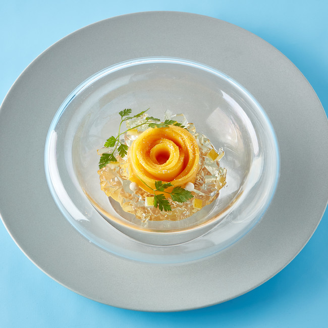 新鮮なマンゴーをカットしてバラの花のように仕立て、レモンのムースとジュレ、マンゴーとパッションフルーツのソースを合わせた「ザ ムーン」のオリジナルのデザート。
