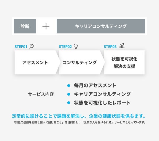 ストレス度の推移やエンゲージメントを可視化する「アセスメント(診断)」、利害関係のない専門家による対話支援をする「キャリアコンサルティング」に加え、組織の状態や傾向を担当カウンセラーより報告する「サクセスミーティング」を定常的に続けることで、課題を解決し、企業の健康状態を保ちます。