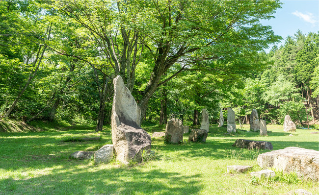 石造のモニュメントがお出迎えするフリーキャンプスペース。スペース内には共同炊事場も。シャワースペースからもほど近いため、快適に過ごせます。