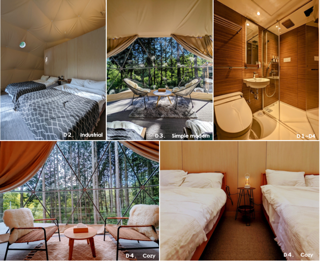 同エリアには、FDomesのドームテントを使用しており、各室異なるコンセプトでセレクトした調度品でぜいたくな空間をご用意しています。全国的にも珍しいシャワー・トイレ・エアコンも完備しました。豊かな自然に恵まれた蒜山の地で、気軽にリッチなアウトドアレジャーを楽しみながら、ゆったりとした時間をお過ごしください。