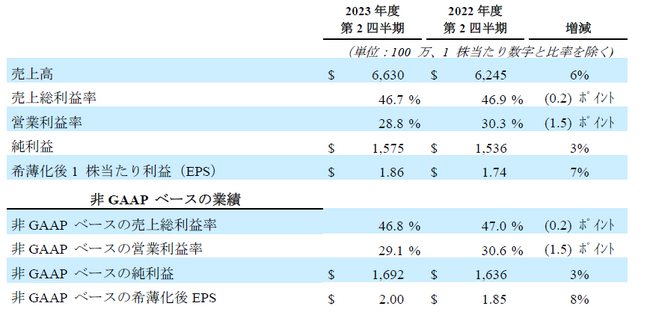第2四半期の売上高は66億3,000万ドルでした。GAAPベースでは、売上総利益率46.7%、営業利益19億1,000万ドル(売上高の28.8%)、1株当たり利益1.86ドルでした。