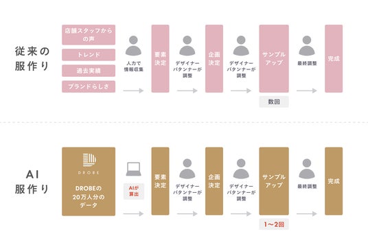 DROBEで収集したデータを元に、従来は人力で行っていた分析業務をAIで自動化し、導いた商品の構成要素に基づきながら、細かいディティールやカラー、着心地、トレンドなどの観点は、「INED CLARO」の培ってきたノウハウ・人が持つ感覚的な意見から取り入れて商品を生産するという工程で行いました。