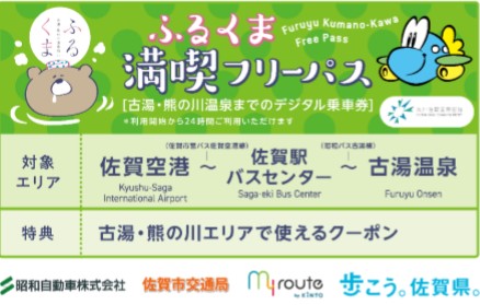 また、もうひとつの『ふるくま満喫フリーパス』は、佐賀市交通局と昭和自動車株式会社とのコラボ商品です。市営バスの佐賀空港線と昭和バスの24時間乗り放題にお得なクーポンも付いて、2022年10月8日から2023年2月28日までの販売となります(ただし、発売予定枚数に達した時点で終了します。)。