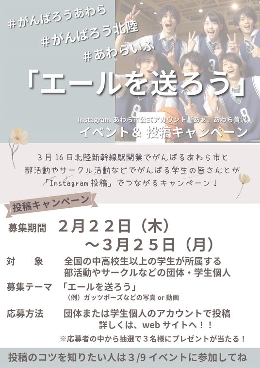 そこで、この度、地元はもちろん、全国の若い世代の方々にあわら市への興味関心をもっていただくことを目的に、イベント及び投稿キャンペーンを企画しました。