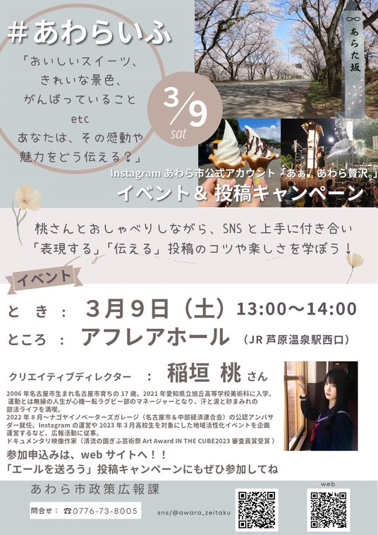 イベントでは、「SNSを楽しむ会 ~あわらから全国にエールを送ろう!~」と題し、想定する参加者(学生)と同世代の稲垣さんが、SNSを楽しみながら、部活動や地元の団体、まちの魅力を見つけて広報してきた経験などをお話しいただくことで、参加者がSNSとの上手な付き合い方を学び、Instagramでの投稿に関心を持ち、あわら市で「いいね!」と思ったことを投稿してもらえるような機運づくりを図ります。