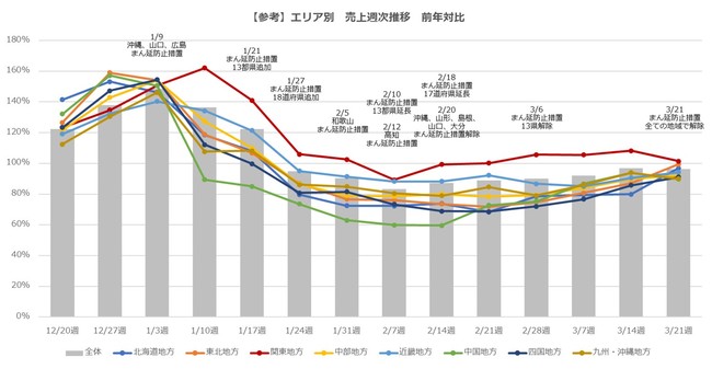 エリア別で見ると、3月は関東地方が前年対比100%超えで推移しているが、これは前年同月に首都圏で緊急事態宣言が発令されており、関東地方の売上が減少していたからである。他のエリアは、まん延防止措置の解除に合わせて、徐々に売上を伸ばしている。