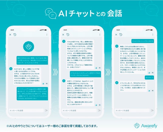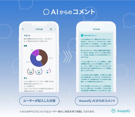当社が運営するAIメンタルヘルスアプリAwarefyには、AIが心の悩みを傾聴してくれたり、解決策の糸口となるアドバイスをくれるAI相談の機能が搭載されています。