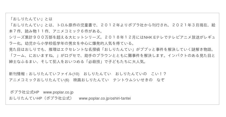 トロル原作の児童書「おしりたんてい」は、幼児から小学校低学年の男女を中心に爆発的人気を得ており、2021年3月現在、シリーズ累計900万部を超える大ヒットシリーズ。