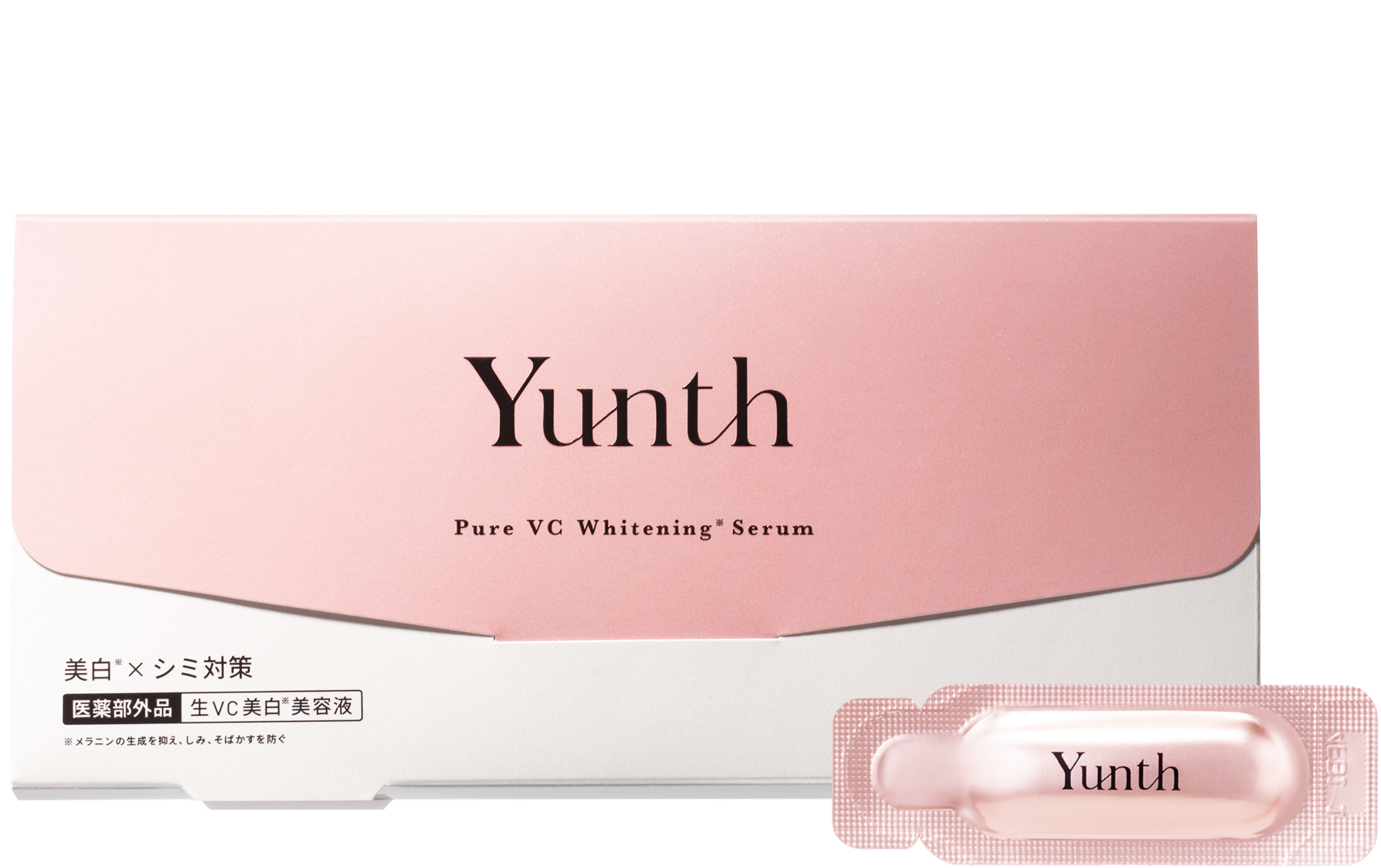 累計販売実績650万個以上*¹の販売実績を誇るYunthブランドの代表アイテム。生ビタミンC*²を独自処方で閉じ込めた「使用期限30秒*³」の導入美容液です。いつでも新鮮な状態で使える個包装パッケージ、高保湿でありながらもベタつかないトロッとしたテクスチャー、有効成分アスコルビン酸(純粋ビタミンC)がメラニンの生成を抑え、しみ・そばかすを防ぎます。