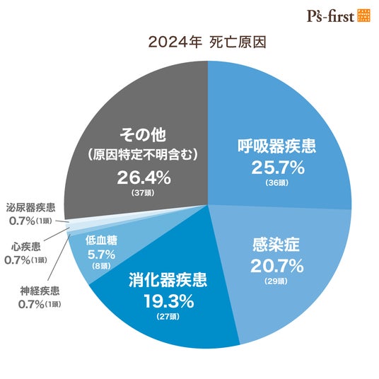 主な死亡原因は呼吸器疾患が36頭25.7%、感染症29頭20.7%、消化器疾患27頭19.3%となり、2024年は上位原因に対する対策を重点的に実施しました。
