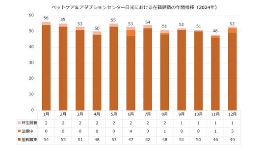 2024年12月末時点においてペットケア&アダプションセンター日光には53頭が生活し、主に治療を終えた、または回復期にある49頭が里親を募集中であり、1頭は終生飼養を行う予定です。