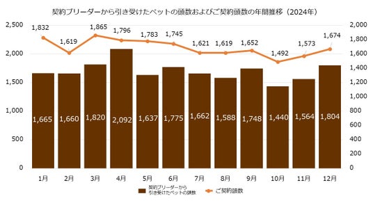契約ブリーダーから引き受けたペットの頭数およびご契約頭数の年間推移(2024年)
