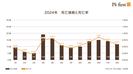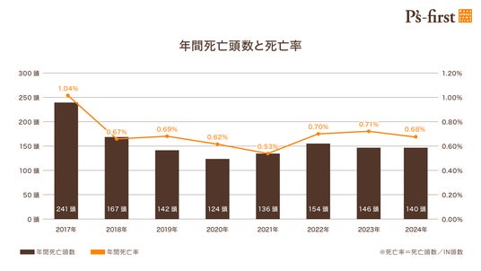 2024年の死亡事故数は140頭(昨年比-6頭)*1、死亡率として0.68%(昨年比-0.03%)*1でした。死亡頭数・死亡率ともに直近7年間で大幅に改善していることが分かります。