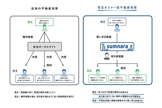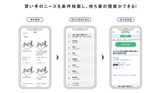 これらの課題解決のため、中古物件専門サイト「sumnara」は「買主の希望条件」が投稿できるマッチングサービスを開始いたしました。従来の不動産ポータルサイトとは異なり、売主が自ら購入希望者を条件検索し、持ち家を提案することができます。