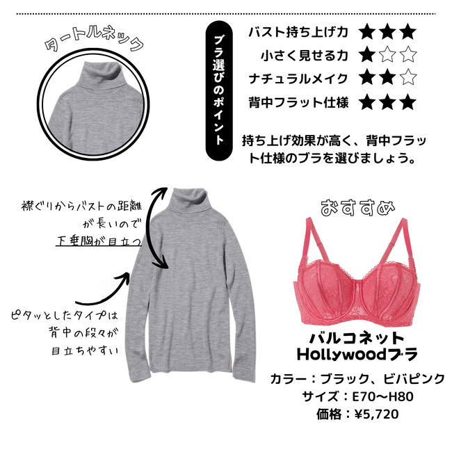 例えば、タートルネックセーターを着用する場合、襟ぐりからバストにかけたデコルテ部分の間延び感が目立ちやすいため、持ち上げ効果の高いブラジャーの着用をおすすめします。