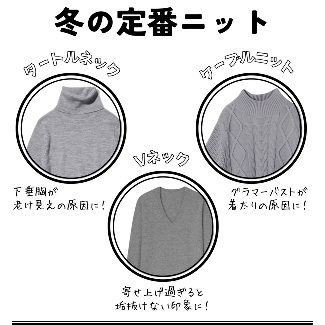 本コンテンツページでは、冬の定番ニット【タートルネック】【ケーブルニット】【Vネック】をすっきりと着こなすための、骨格タイプ別おすすめブラジャーをご紹介しています。